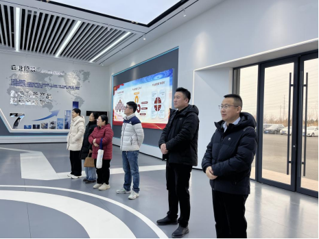 蓝湾新材料人力总监张福永、人力经理郭龙及行政主管李月海带队参观公司展厅,详细介绍企业发展历程、核心技术、产品布局及行业发展趋势,让教师直观了解企业生产经营与人才需求实际。