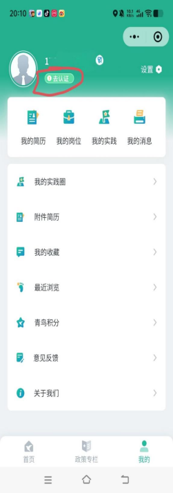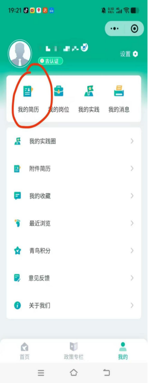4. 使用“青鸟计划”小程序报名,请先进入右下角“我的”页面完成个人信息认证。请确保所填信息真实准确,提交后将由学院团总支书记进行审核。