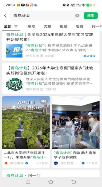 部分地区会通过团委公众号发布“返家乡”“三下乡”“青鸟计划”系列推文,介绍活动内容及要求,公布实习实践岗位。可以通过关注地方团委公众号,在规定时间报名参与寒假青鸟计划实习实践活动。